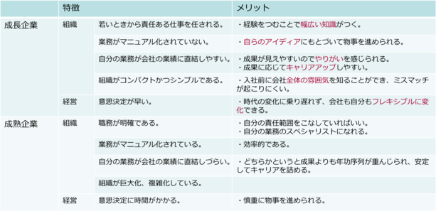 その他の特徴および成熟企業との比較を表にまとめていますので、